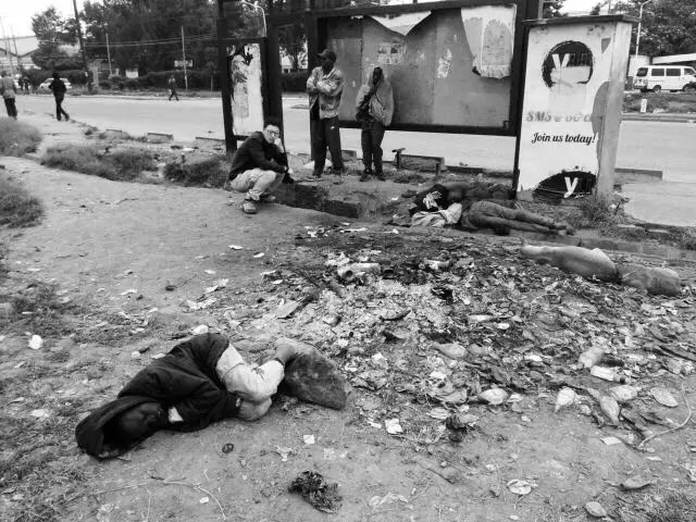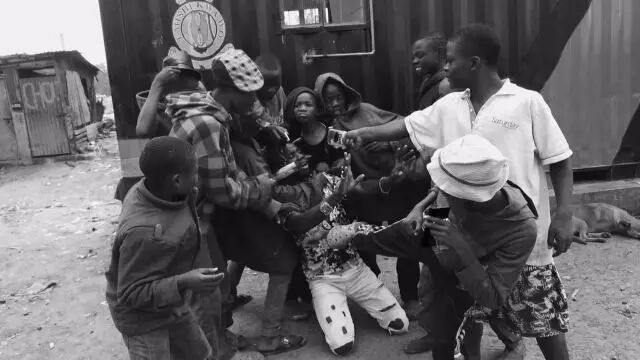 这群男孩儿平时流浪在街头。有的人其实有家,但他们仍然觉得街头是最好的选择。从修鞋的地摊上买一种胶水,口鼻并用地吸。麻痹神经,就不会觉得饿或者冷,晚上躺在地上才能睡着。内罗毕之前一直都只有十三二度。